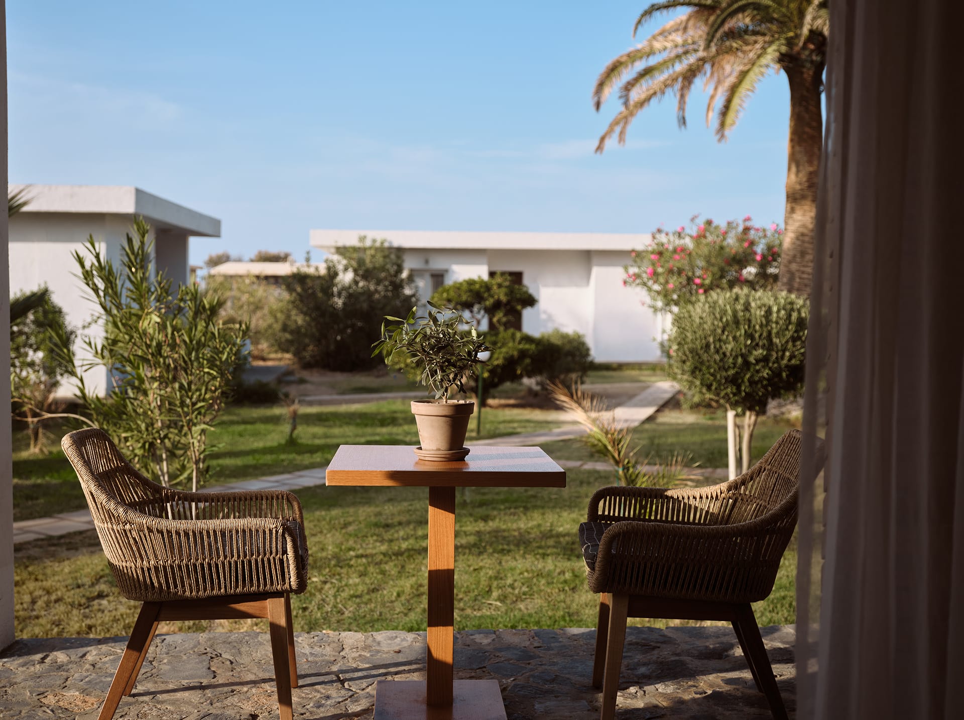 Our Bungalow Garden View, 16 - 20 sq. m., has two twin beds or one double bed and a sofa bed and their terrace facing the hotel's garden. It features an ensuite bathroom with a bathtub, complimentary bathroom toiletries, slippers & a hairdryer. It is equipped with a mini-fridge with refreshments, coffee & tea making facilities, individually controlled air conditioning, free Wi-Fi internet access, telephone, safe with extra charge, satellite flat-screen 32” TV and pool/beach towels.