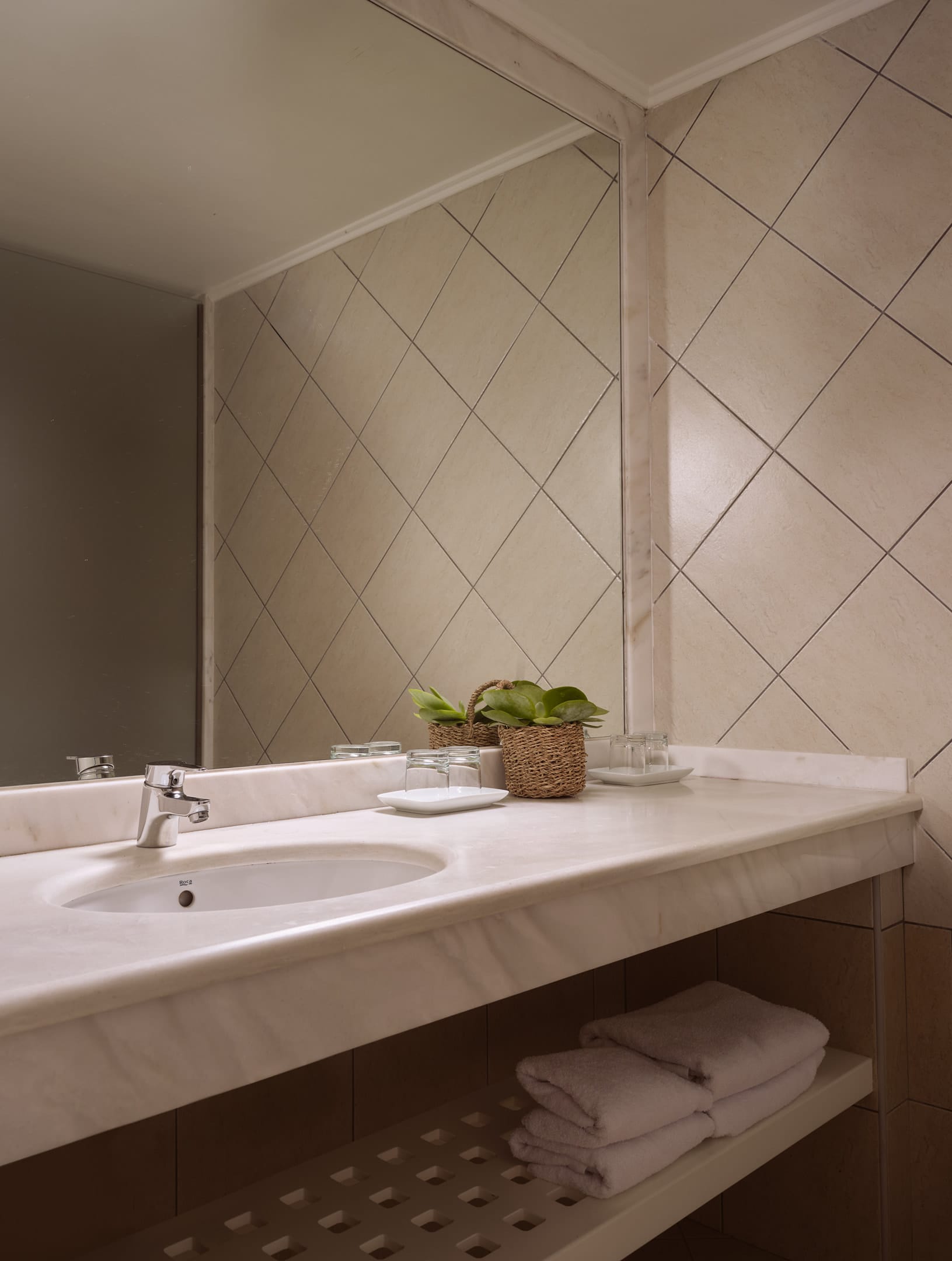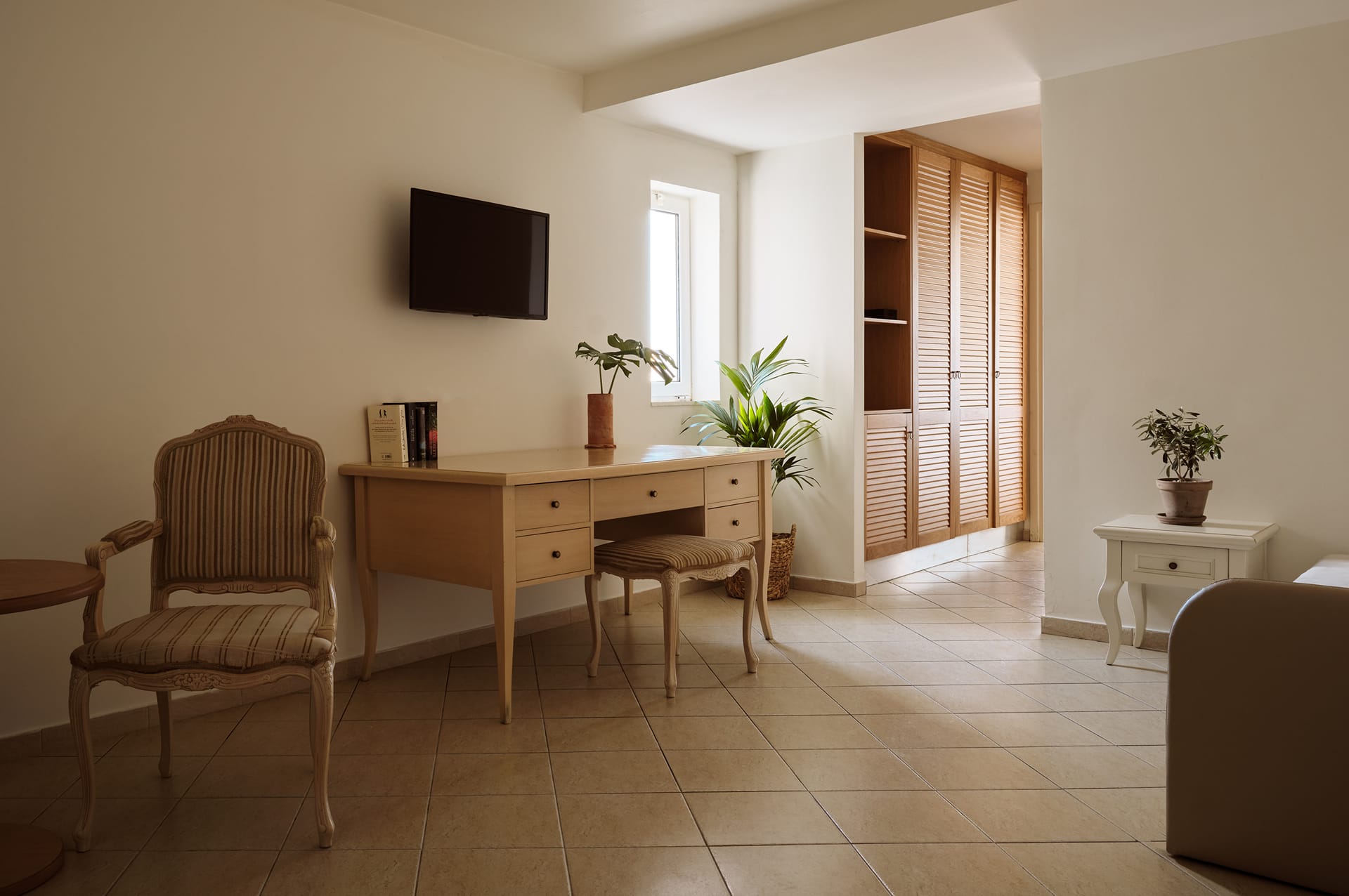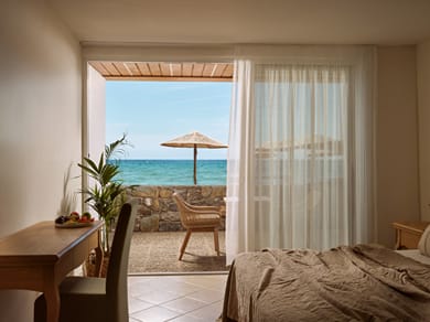 The recently renovated Premium Junior Suite located at the waterfront offers guests magnificent views of the Aegean Sea. The junior suite of 35 sq. m., has one double bed in the main bedroom area and one sofa which turns into a bed in the living room. It features an ensuite bathroom with a bathtub, complimentary bathroom toiletries, slippers and a hairdryer. It is equipped with a mini-fridge with refreshments, coffee/tea making facilities, individually controlled air conditioning, free Wi-Fi internet access, telephone, safe with extra charge, satellite flat-screen 32” TV and pool/beach towels. It can accommodate up to 3 adults and 1 child.